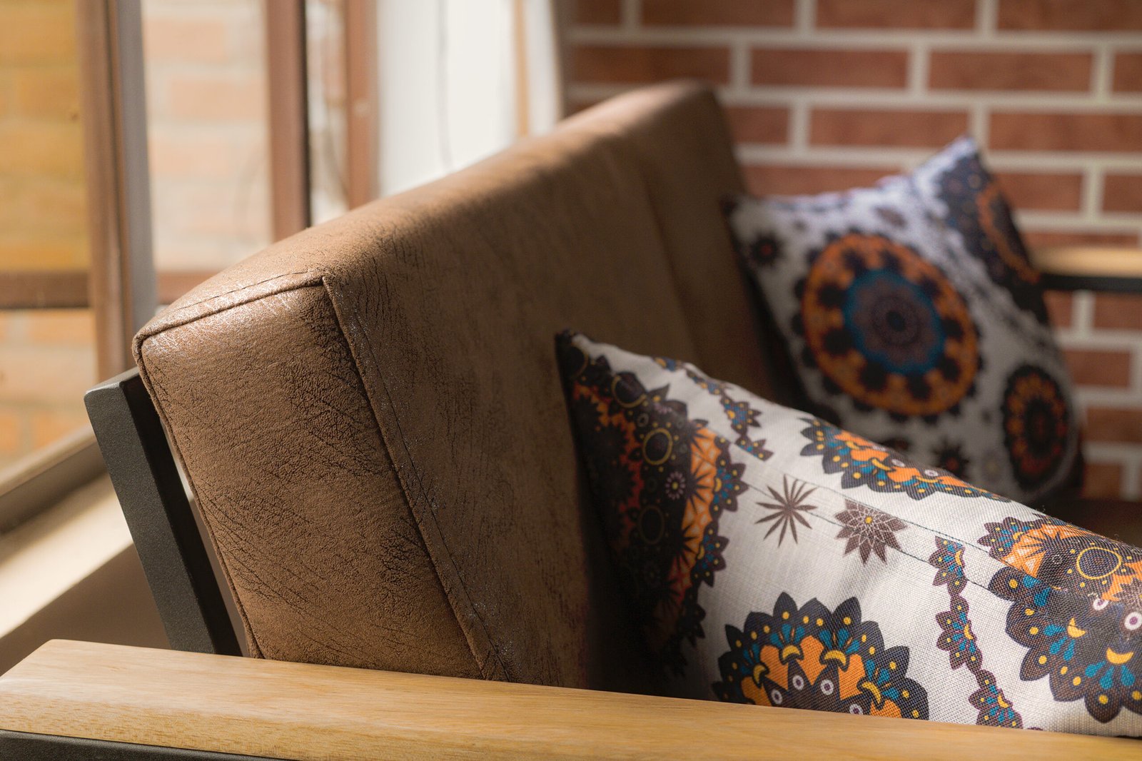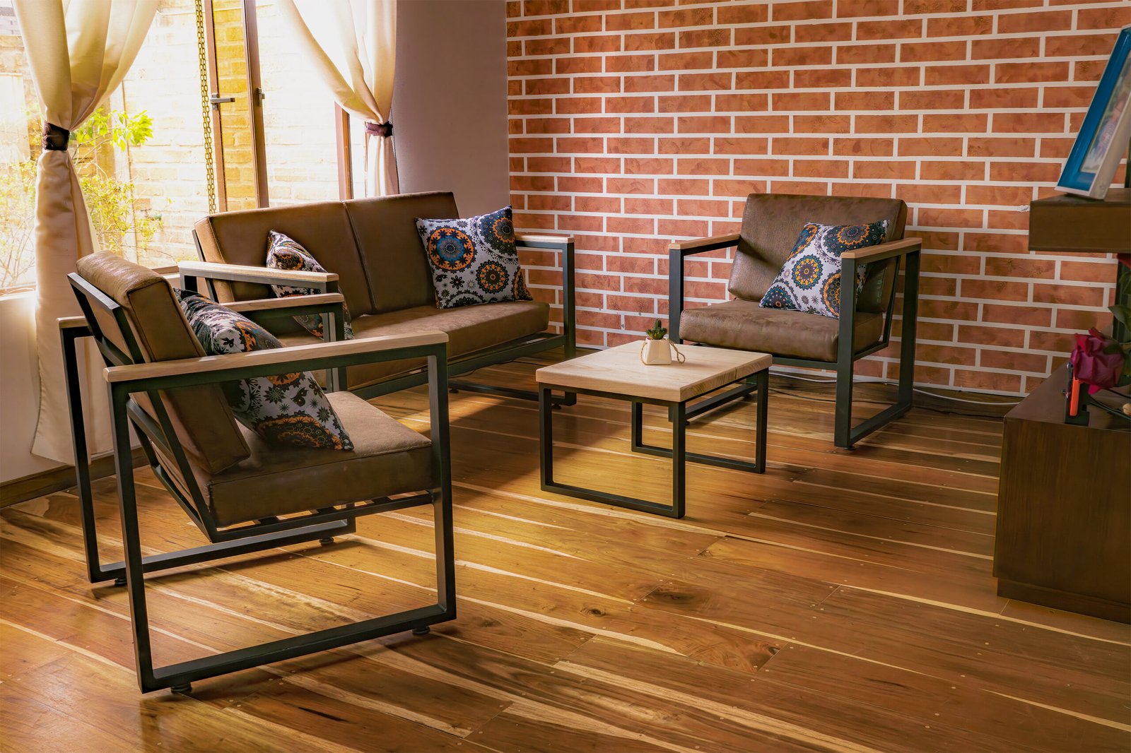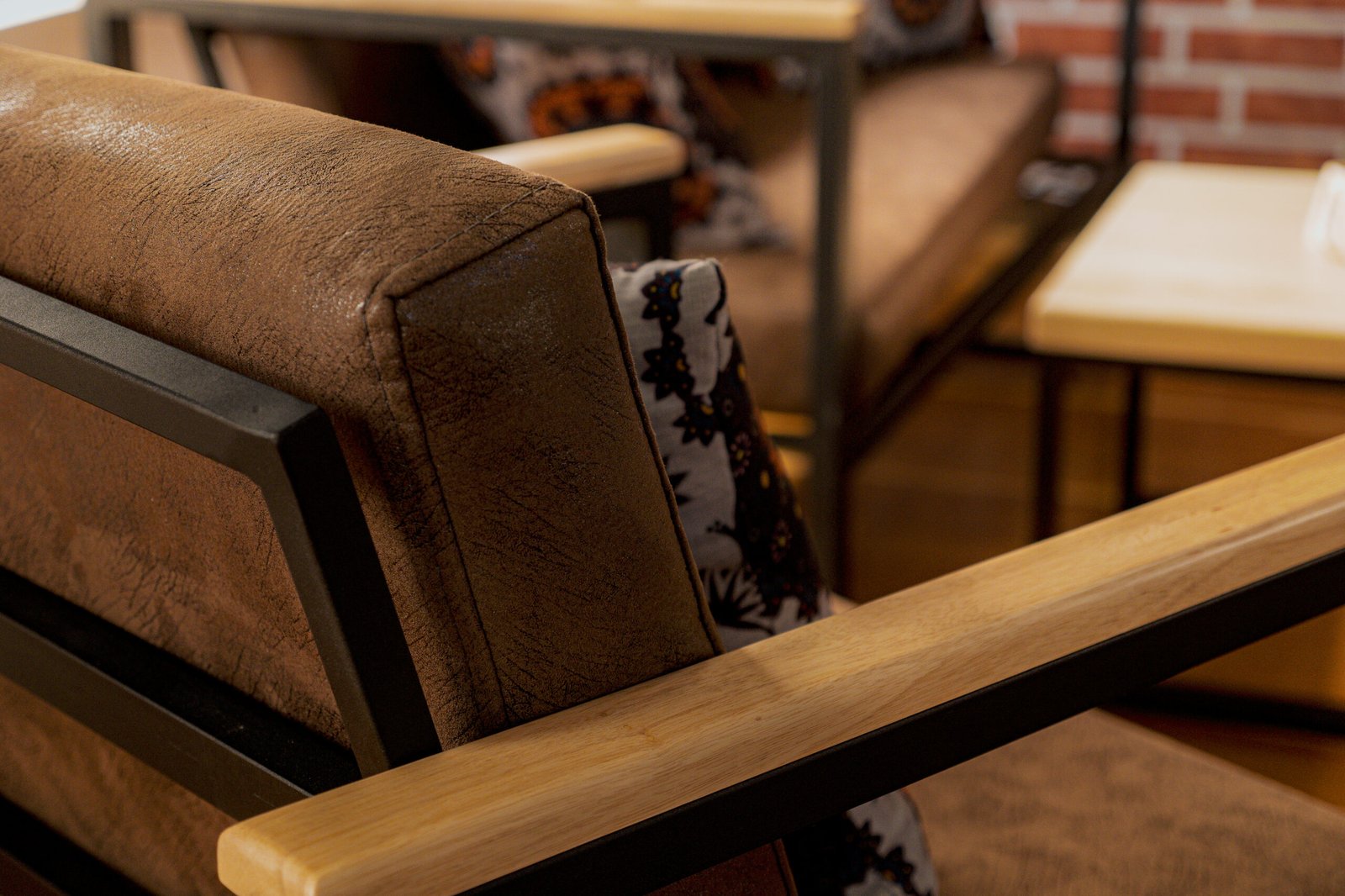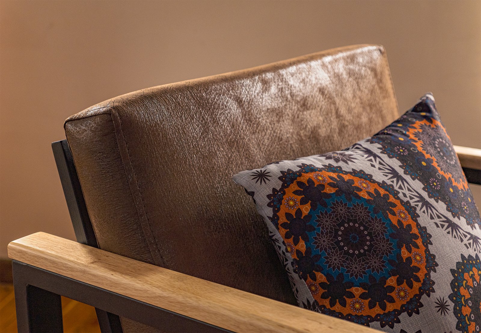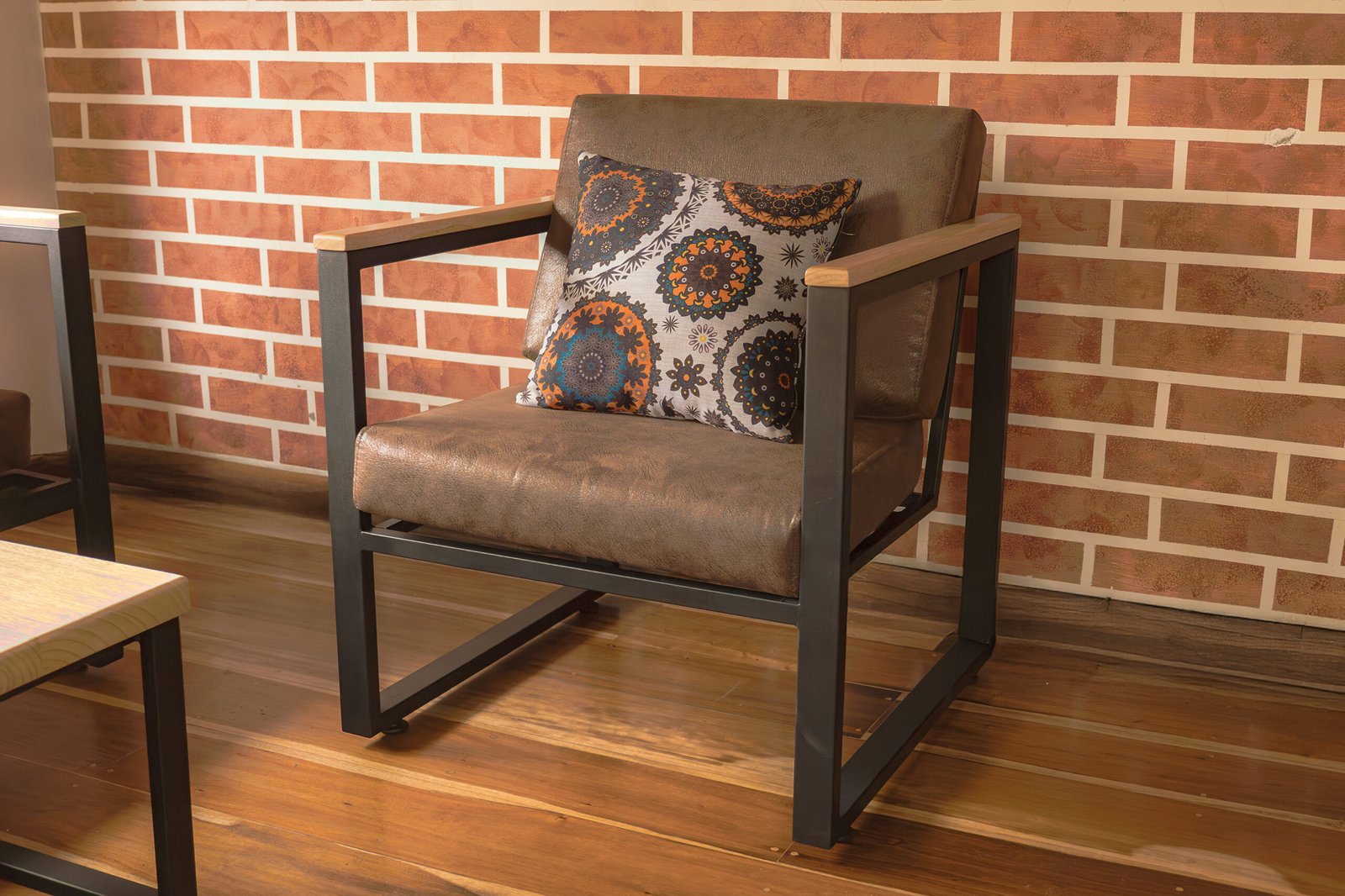 Sala estilo industrial, fabricada con estructura metálica y detalles en madera natural. Tapizado en cuero ecológico café, resistente y fácil de limpiar, con cojines decorativos que aportan confort y un diseño moderno. Ideal para personalizar tu espacio con elegancia y durabilidad.